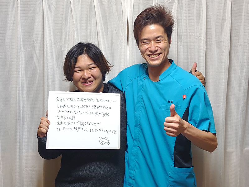 先生の真剣に話を聞いてくださる姿勢に、不安なことや肩以外の悩みを聞いていただき、凄く安心しました!